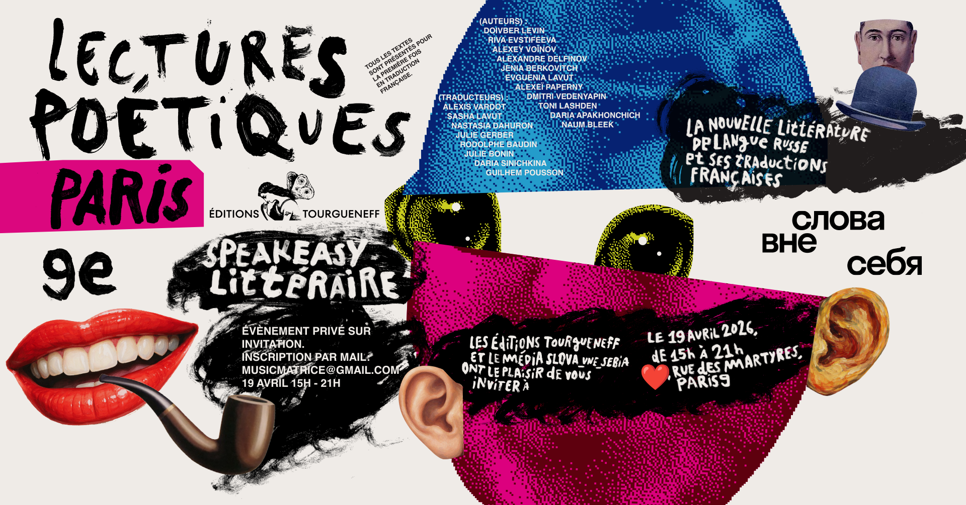 inscription + info LECTURES À LA MATRICECONCERT AU THE DISSIDENT CLUB Les Éditions Tourgueneff, slova_vne_sebia et Interbokont le plaisir de vous inviter à desLECTURES À LA MATRICELa nouvelle littérature en langue russe et ses traductions en françaisLe 19 avril 2026, de 15h à 21h, à l’espace La Matrice, métro Notre-Dame-des-Lorettes***speakeasy***les informations d’accès vous seront communiquer par retour de mailParticipation libre / Вход свободный по записиmusicmatrice@gmail.com / contact@editions-tourgueneff.comà partir de 21h au The Dissident Club*15h Alexeï Voinov lit les fragments de son texte Hiver sans neigeЗима без снега, 2025 / Hiver sans neige, traduit par Guilhem Pousson, Éditions au bout de la ville, 2026*Rodolphe Baudin lit Doivber LevinПолет Герра Думкопфа, Бабель, 2021 / Le voyage dans les airs de Herr Dummkopf, 2026*Riva Evstifeeva et Daria SinichkinaИнтернатские рассказы, 2023 / Récits de l’internat, 2025*17h00Daria Apakhonchich et Julie Bonin12 или 13 историй, 2025 / Comme l’eau dans un poisson, 2026*toni lashden et Julie BoninЧорни лес, Mianie Niama, 2024 / Forêt noire, 2026* 18h00Dmitri Vedenyapin et Julie GerberСтихотворения разных лет / Selection de poèmes*Nastassia Dahuron lit des poèmes de Jenia Berkovitch* 19h00Evguenia Lavout et Alexandre LavoutТупые и острые предметы, 2025*20hAlexandre Delfinov et Alexeï Vardot* * *21h00 THE DISSIDENT CLUB, 58 rue Richer, 75009 ParisNaum BlickAlexei Paperny Participation libre / Вход свободный.Réservations : musicmatrice@gmail.com запись
